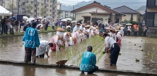 鹿児島神宮の御田植祭は、旧暦の5月5日に近い日曜日催行される。今年は、6月25日だった。当日は、朝からの小雨で、絶好の田植え日和になった。 県指定有形民俗文化財の「宮内の田の神」の前で、田の神様が舞を奉納されるなどの神事が厳かに進んだ後、まず姶…