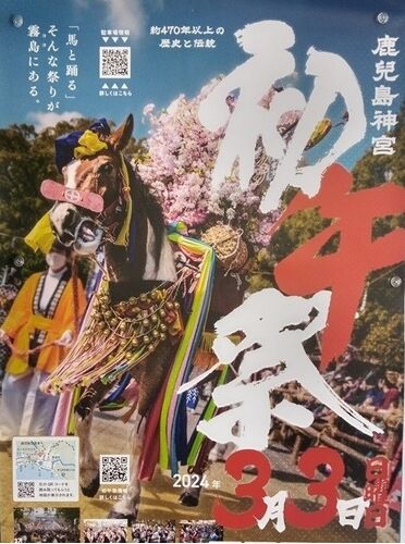 鹿児島市のおはら祭り、曽於市の弥五郎どん祭りとともに、鹿児島の三大祭りの一つである「鹿児島神宮の初午祭」が、令和6年は3月3日の日曜日に行われる。 祭りの主役は、多くの鈴が連なった胸飾り、花や錦などで飾った鞍を着け、ステップを踏みながら踊る馬…